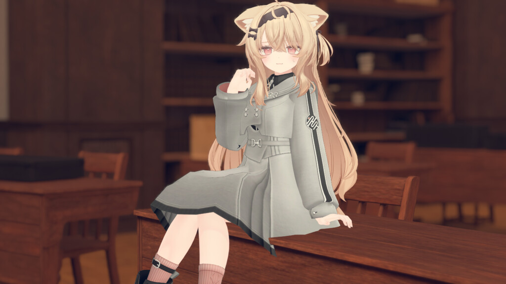 次は、「エク」が通う学校を背景に写真を撮っていきましょう。 「机の上で座っていたら先生に見られてしまった」ような、少し困った顔……可愛くわかりやすい表情が、ついついこういう事があったのだろう……と推測してしまうような世界観を作り出しています。