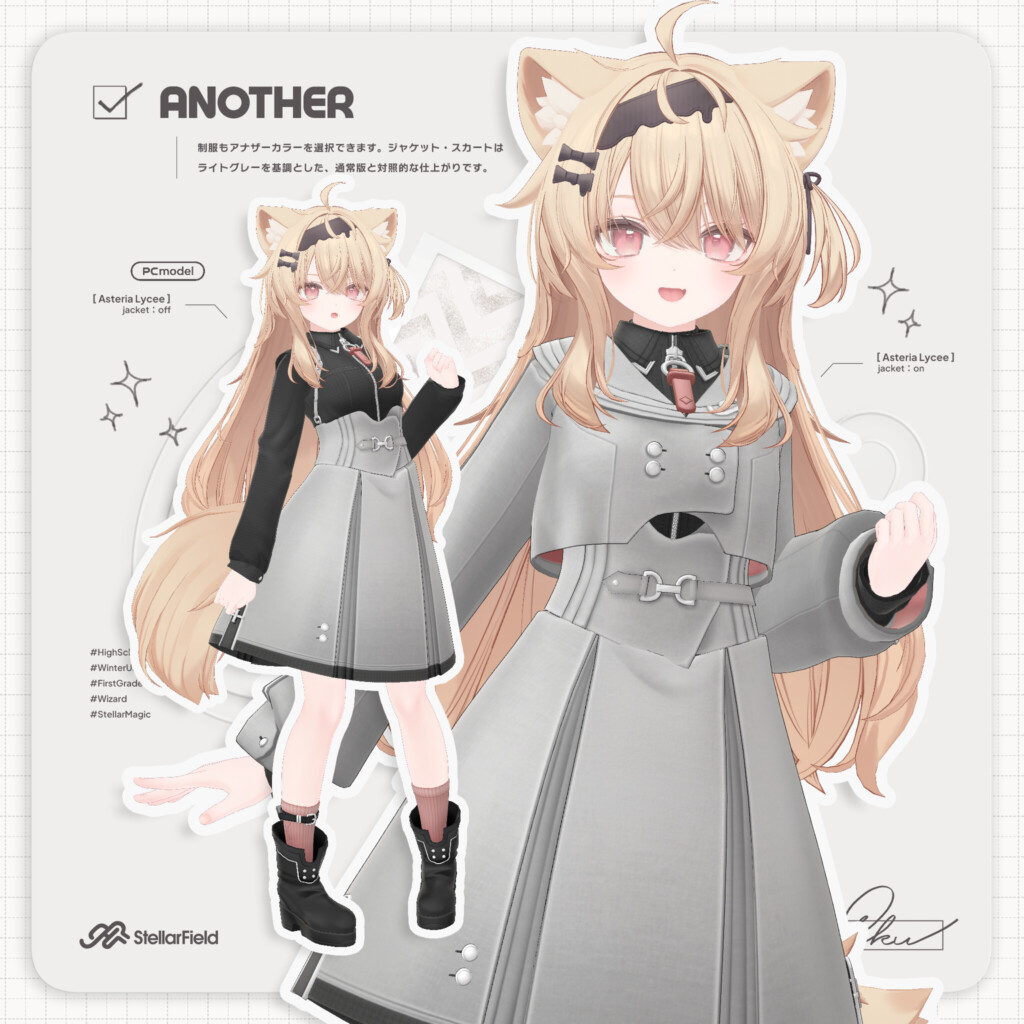 また、アナザーカラーも搭載。 儚さと綺麗さが強調され、デフォルトカラーのエクとは違った雰囲気を見せてくれます。 制服にもアナザーカラーの灰色バージョンがあるため、雰囲気を変えたい時に、すぐ対応できるアバターになっています。