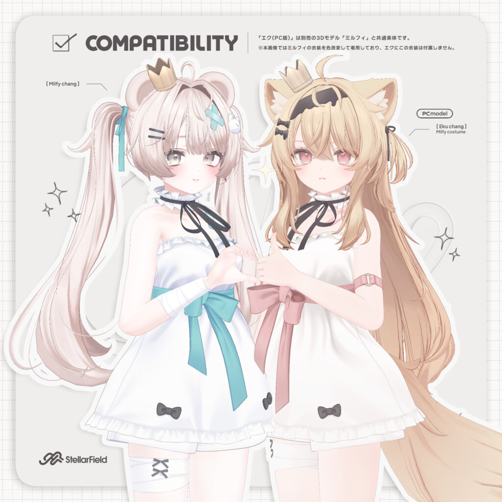 更に、素体はアバターデザイン&モデリングを担当している「有坂みと」さんのBOOTHショップ「ぷらすわん」の「ミルフィ」と共通。ミルフィに対応している衣装を着せることが可能なため、おそろいコーデや、二人のデフォルト衣装を交換してみる……なんていうのも面白いかも知れません。