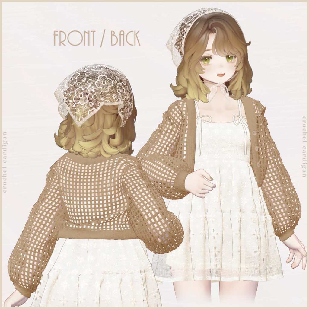 「くれこのさんD」から販売されている「Crochet cardigan」は、透かし編みが特徴的なカーディガンです。初秋から中秋までの、気温が定期的に変わるような秋にも対応できるような、オシャレで大人な雰囲気のアバターに似合うアイテムになっています。