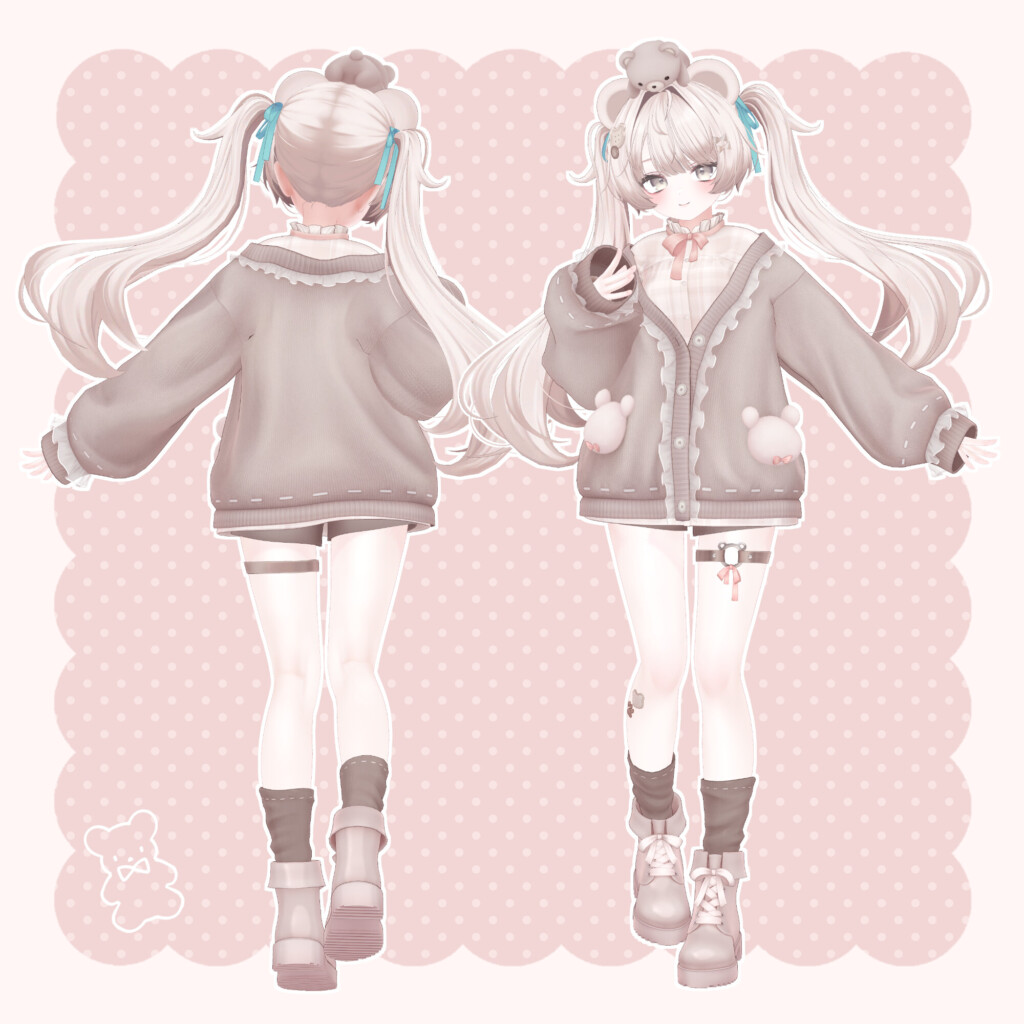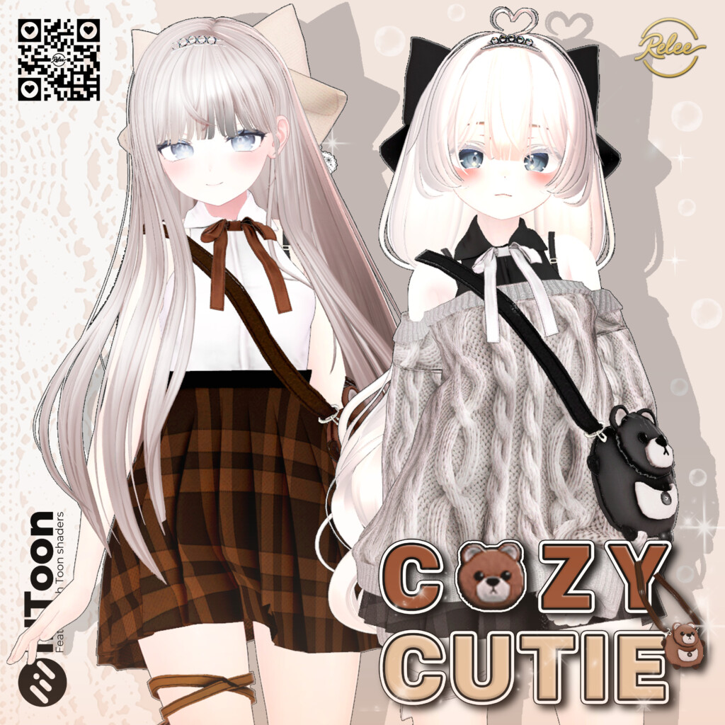 「#Relee」から販売されている「Cozy Cutie」は、13色のカラーバリエーションがあり、トップス・ボトムスとニットを上から着こなしたスタイルの切り替えが可能な衣装です。クマ型の肩掛けカバンや、様々な部分のリボンがキュートさをアピールしてくれるアイテムになっています。