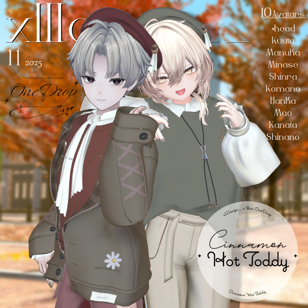「xIIIange__」(てんすりーあんじゅ)から販売されている「Cinnamon Hot Toddy」は、男性アバター/少年アバター向けの秋服です。 大きめのジャケットとシンプルながらも可愛さやクールさの詰まったデザイン、細かな部分の装飾が特徴的な衣装になっています。