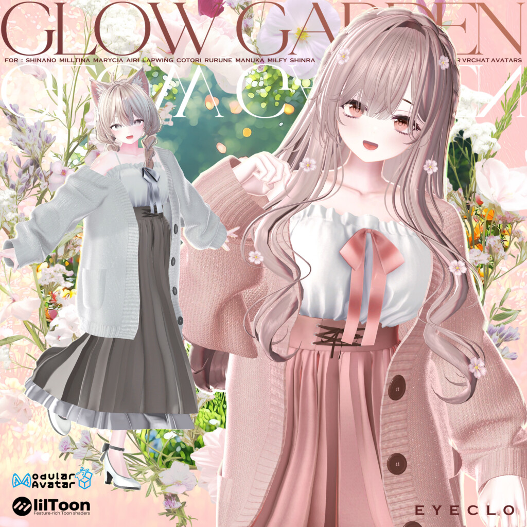 「EYECLO」から販売されている「GlowGarden」は、カーディガンとリボンブラウス、ロングスカートを組み合わせたフェミニンな衣装です。淡いカラーとやわらかな素材感が、秋の穏やかな空気のなかでふんわりと映え、普段のワールド巡りもおしゃれな時間に変えてくれます。