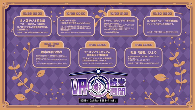 じむの朔さんが主催するコミュニティ「FM言ノ葉」は、キャンペーン「VR読書週間」を10月27日〜11月9日に開催することを発表しました。こちらは現実の読書週間にあわせた催しとして毎年開催されており、今年は8つのイベントが参加。朗読会や読み聞かせイベントなどが予定されています。