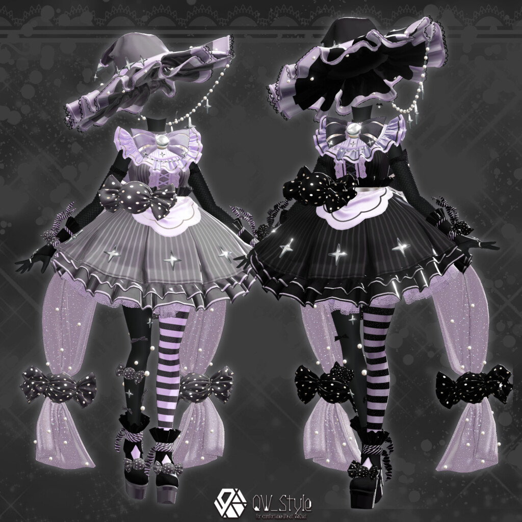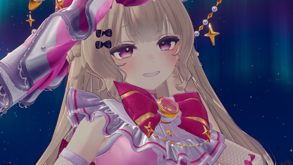 まずVRChat内で見て気づくのは、大きなスカートと帽子! フリルがしっかりとついており、更にパニエの膨らみが「少女の夢」のようなものをしっかりと詰め込んでおり、スカートの星のモチーフも夜空にきらめく星屑のように輝きます。
