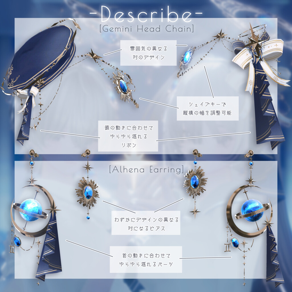 「Astralis Orbit – ふたご座/Gemini」は、ふたご座をモチーフにしたアクセサリーアイテム。雰囲気の異なる対になったヘッドチェインと帽子、そしてピアスがあしらわれているため、自分の大事な人と一緒に使うのにもおすすめなアイテムになっています。