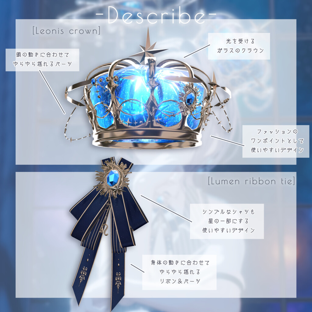 「Astralis Orbit – しし座/Leo」は、しし座をモチーフにしたアクセサリーアイテム。おしゃれな青が目立つガラスの王冠と、シャツや衣装をアレンジすることの出来るリボンタイが、獅子の強さを表現出来るアイテムになっています。