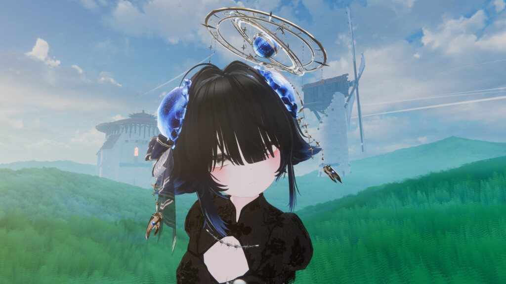 実際に着用してみると、顔まわりで揺れる天秤型の装飾が目を引きます。クールな雰囲気のアバターや、シスター風などの装いと合わせると、まるで神話の登場人物のような神秘的な印象を演出してくれます。また、チョーカーネックレスは首元にさりげない輝きを添え、コーデ全体に上品なアクセントを加えてくれるアイテムになっています。