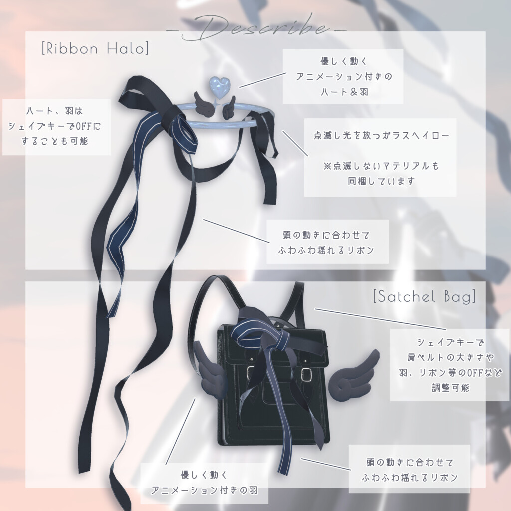 「Auriel Whim – 天使アイテムセット」は、天使のリングや羽根をアレンジしたヘイローとバッグのセット。ふわふわ揺れるリボンや、やわらかく動く羽根のアニメーションが、さりげない可愛さを添えてくれます。