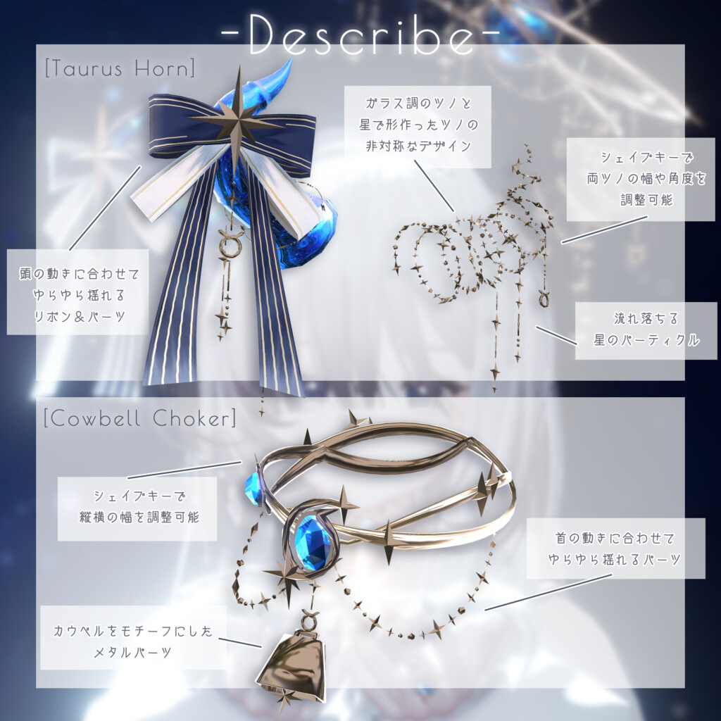 「Astralis Orbit – おうし座/Taurus」は、おうし座をモチーフにしたアクセサリーアイテム。大きなガラス状のツノとカウベルをモチーフにしたメタルパーツ付きのチョーカーがセットになった、おうし座の大胆な雰囲気が感じられるアイテムになっています。