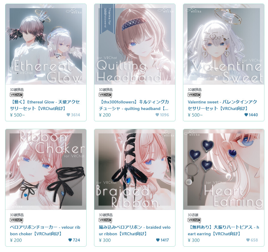 ふんわりとやさしい雰囲気が魅力のBOOTHショップ「Re.works」 星座をモチーフにしたアクセサリーを中心に、アバターにオシャレな「星空の煌めき」や、「優しげな雰囲気」を纏わせてくれるアイテムが揃っています。