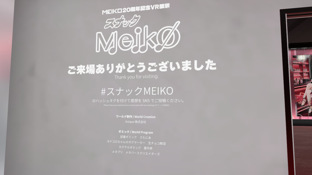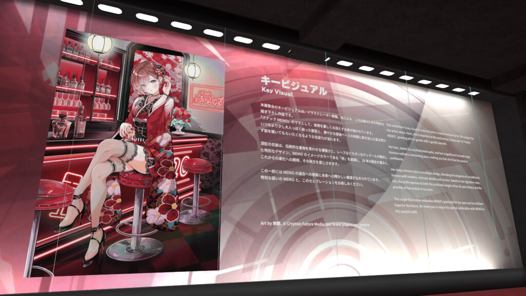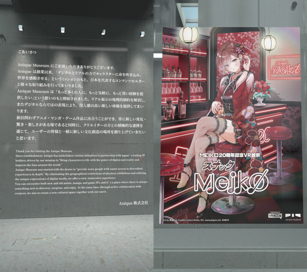 そして今回、その20周年を記念した特別展示として登場したのが、「MEIKO 20周年記念VR展示 スナックMEIKO」。Anique株式会社が手掛けるVRChat内の展覧会で、もうすぐ21周年を迎える今もなお、MEIKOの存在感を感じさせてくれる空間になっています。今回メタカル最前線では、そんな「MEIKO 20周年記念VR展示 スナックMEIKO」をレポートしていきます。