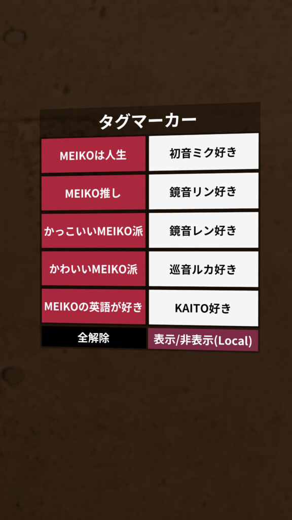 展示に入って、すぐ気づくのはタグマーカー、自分がMEIKOの事をとにかく「好き」であるという事をアピール出来るタグを頭に付けることが出来ます、また他のボーカロイド好きも付けれるようなタグマーカーもあります。