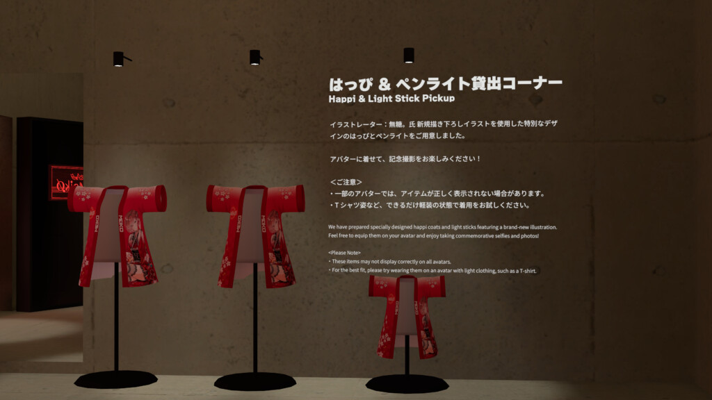 そして、はっぴ&ペンライトの貸出コーナーも! 描き下ろしのイラスト(Art by 無糖。 © Crypton Future Media, INC. www.piapro.net) が法被のデザインになっており、アバターに合わせて着ることが可能になっています。 自分のアバターでしっかり「MEIKO推し」をアピールできるアイテムになっていますよ。