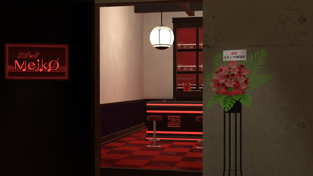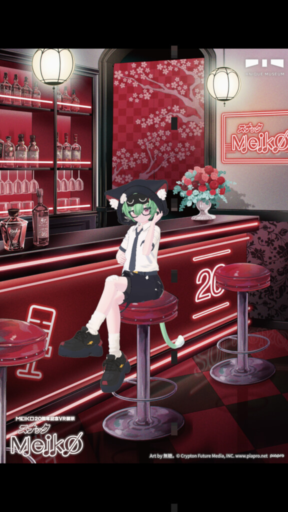 開催場所は「Anique Museum」 過去には「serial experiments lain」のVR展覧会を開催し、人気を博しました。 そんな「Anique Museum」が今回テーマに掲げたのが「スナックMEIKO」 ファンイメージとして根付いた、「ミクといえばネギ!」のようなアイテムが、MEIKOは「お酒」 それがしっかりと反映されたテーマになっています。