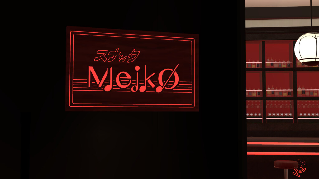 そして入口には「スナックMEIKO」が、描き下ろしイラストをしっかりと再現したデザインになっており、まるで描き下ろしイラストの世界に入ってしまったような雰囲気すら感じられます。 バーテーブルの下のマイクのネオンサインもMEIKOらしさをしっかりとアピール!