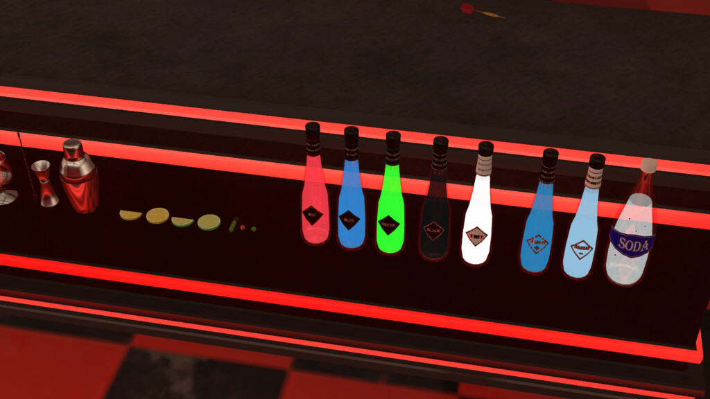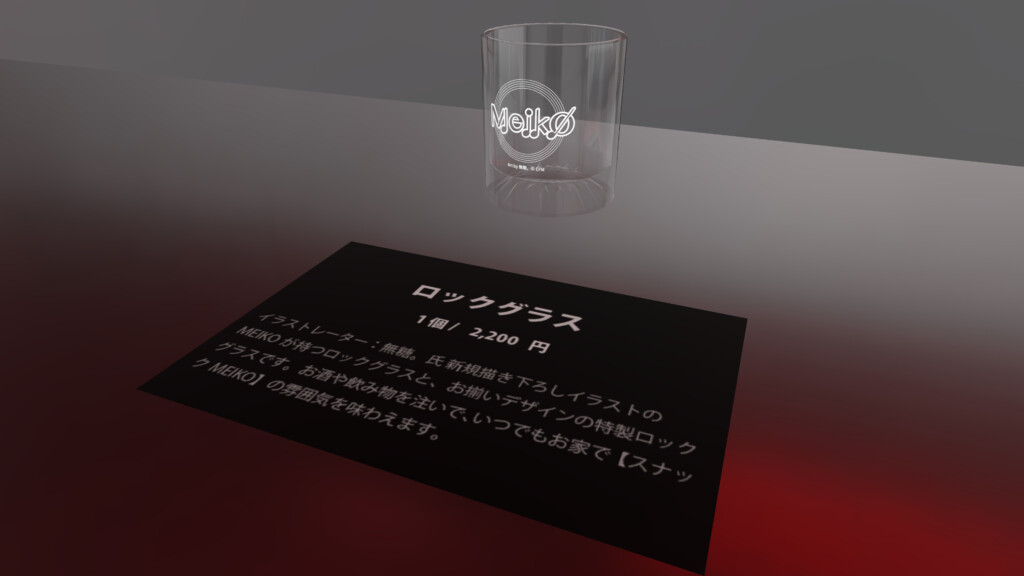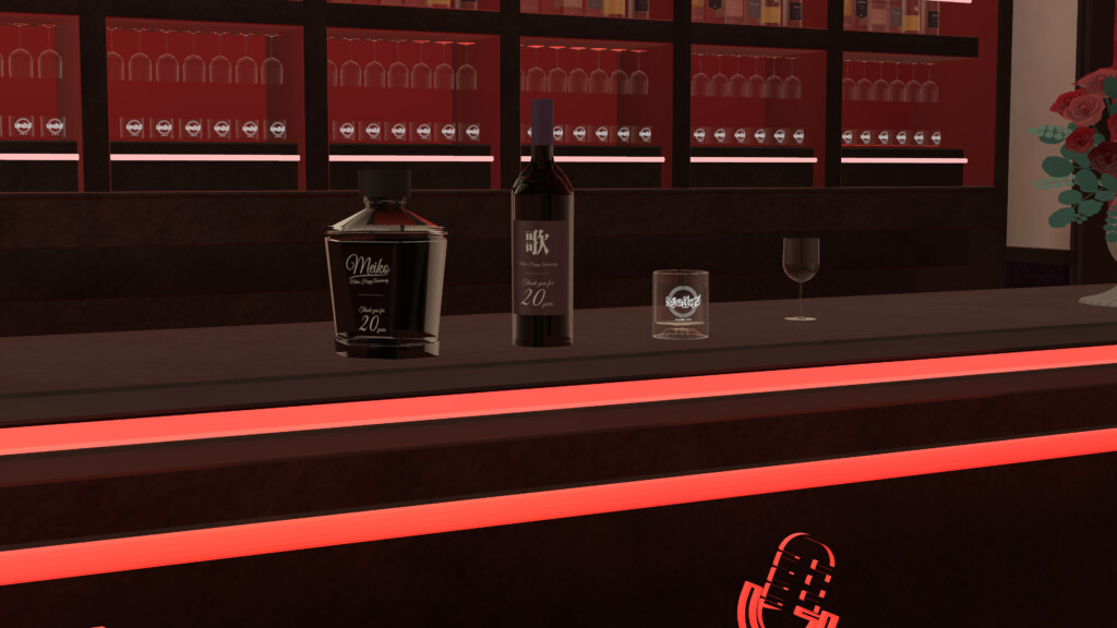 そして、バーテーブルの上には20周年を記念したボトルと、ロックグラスが載っています。 また、VRChatではおなじみのカクテルギミックもあるため、バーカウンターからカクテルを作って提供するなんてことも可能です。 ここでMEIKO20周年を祝って祝杯を上げる、なんていうのも良いかも知れません。