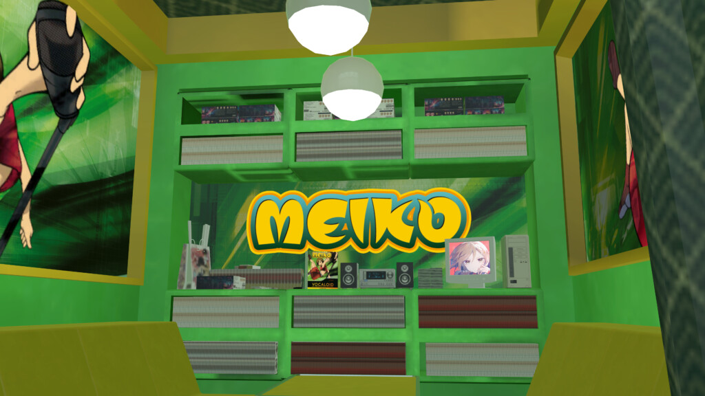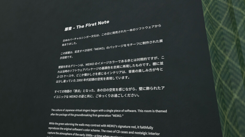 現代のイメージと違って初代MEIKOは緑 x 黄色がモチーフでした。それがしっかりと再現された部屋に、飾ってあるPCも古い物になっており、2004年当時の空気感のようなものも感じられる場所になっています。