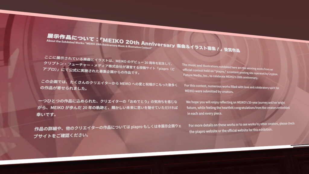 ここではBGMの楽曲やイラストを眺めることが出来ます。 MEIKO20周年を記念して、「piapro(ピアプロ)」の企画で集められたクリエイター達の思いのようなものを感じられる楽曲やイラストが集まっています。