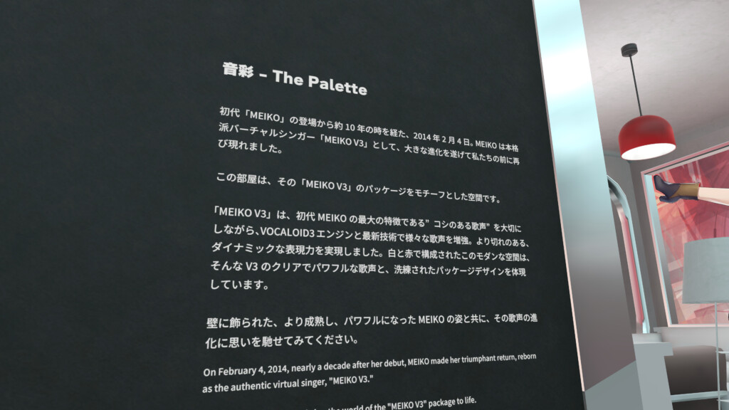 次の展示空間は2014年、MEIKO V3のパッケージがモチーフになった場所になっています。 白と赤がモチーフになった、スタイリッシュで大人らしいデザインが魅力的。 丁寧に作られた空気感を感じることがきっと出来るはずです。