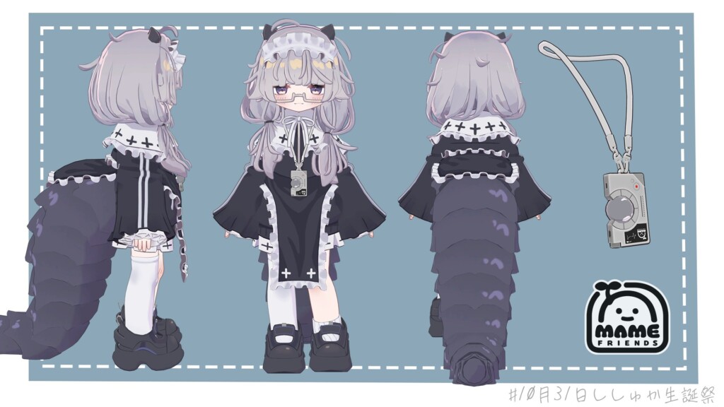 全体の印象としては、通常のまめふれんずより頭が少し小さめにデザインされているため、どこか「いつものまめふれんずより大人びた」雰囲気を感じられます。大きなトカゲの尻尾が服を押し上げる造形もかわいいポイントです。。 また、画像内に「#10月31日ししゅか生誕祭」という文字がある事に気づいた人もいるかもしれません。 実は発売記念として、「#10月31日ししゅか生誕祭」を付けてイラストを投稿するキャンペーンが行われていました。