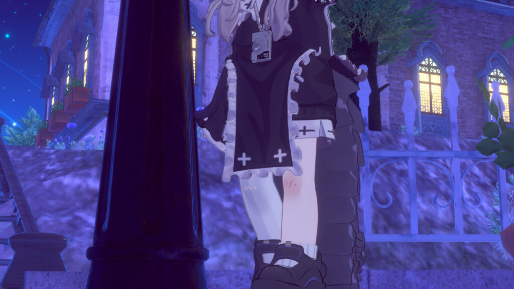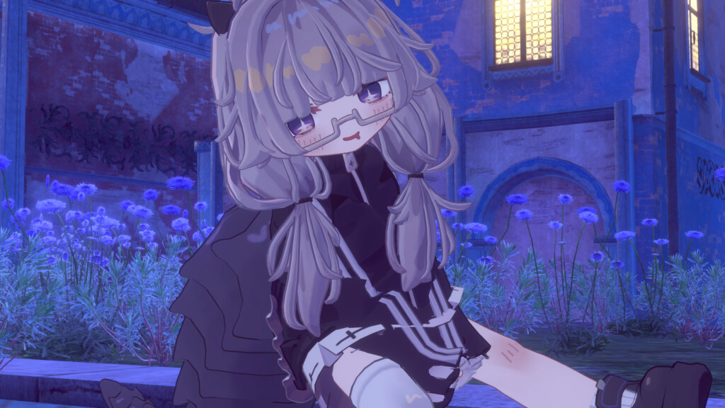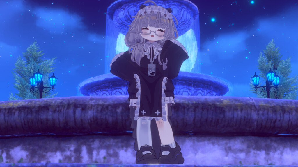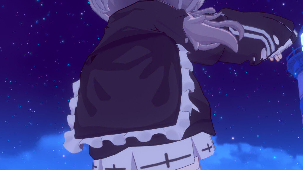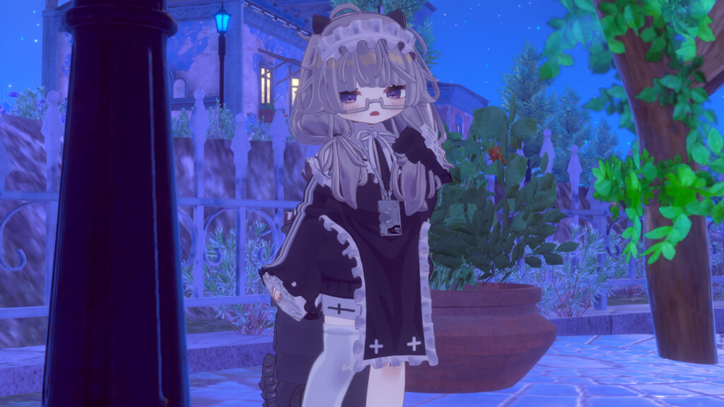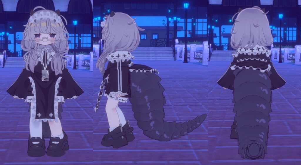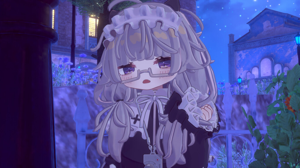 VRChat内で見ていると最初に目に入るのは、シスター風のゴシックな雰囲気や十字架の意匠で、どこか静かで上品さをまとった衣装です。片足だけ履いた白いソックスや、落ち着いた灰色の髪色が全体のデザインを引き締めています。