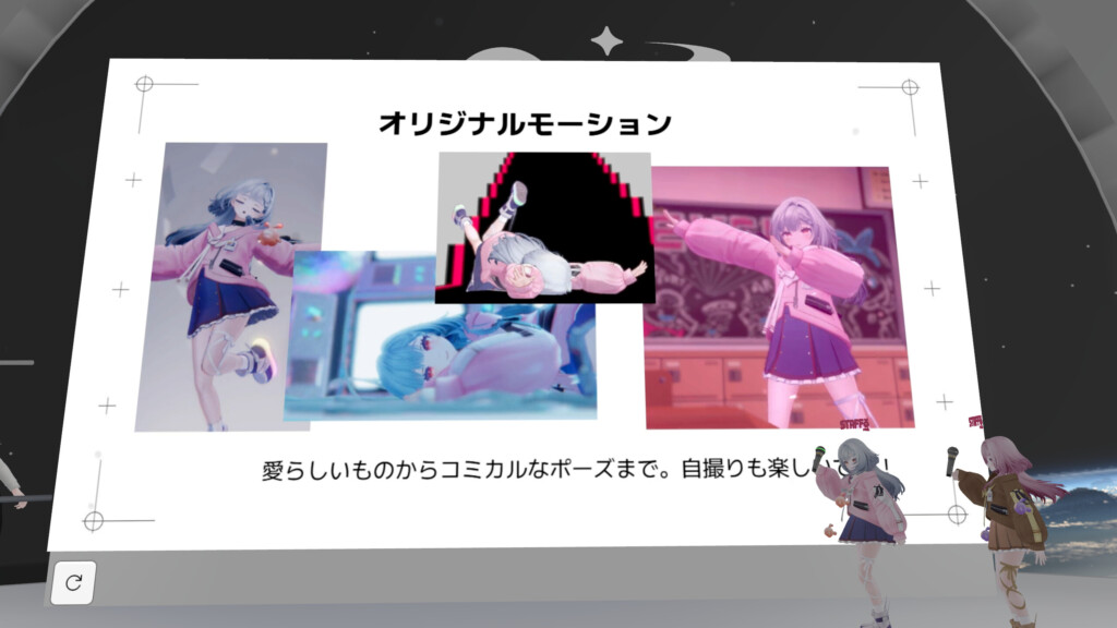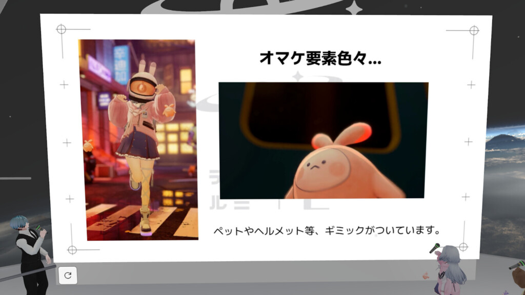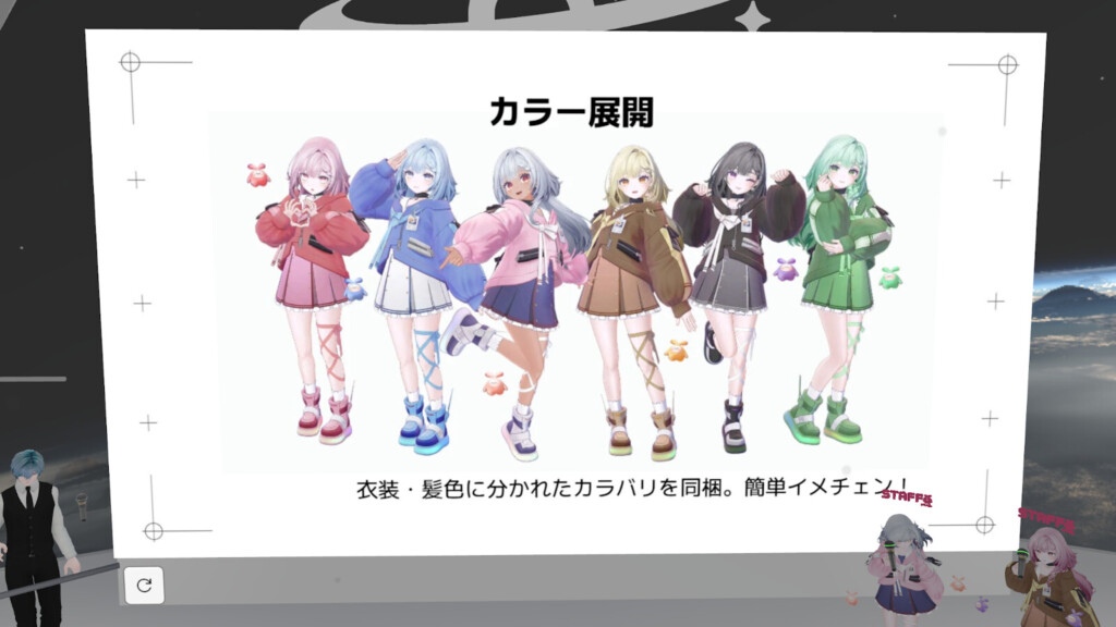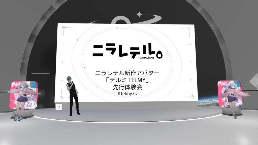 お披露目会の会場は専用のワールドが用意されており、大きな舞台、そしてその両隣にはサンプルアバターが設置されていました。宇宙らしく、窓からは青い地球をみることができます。
