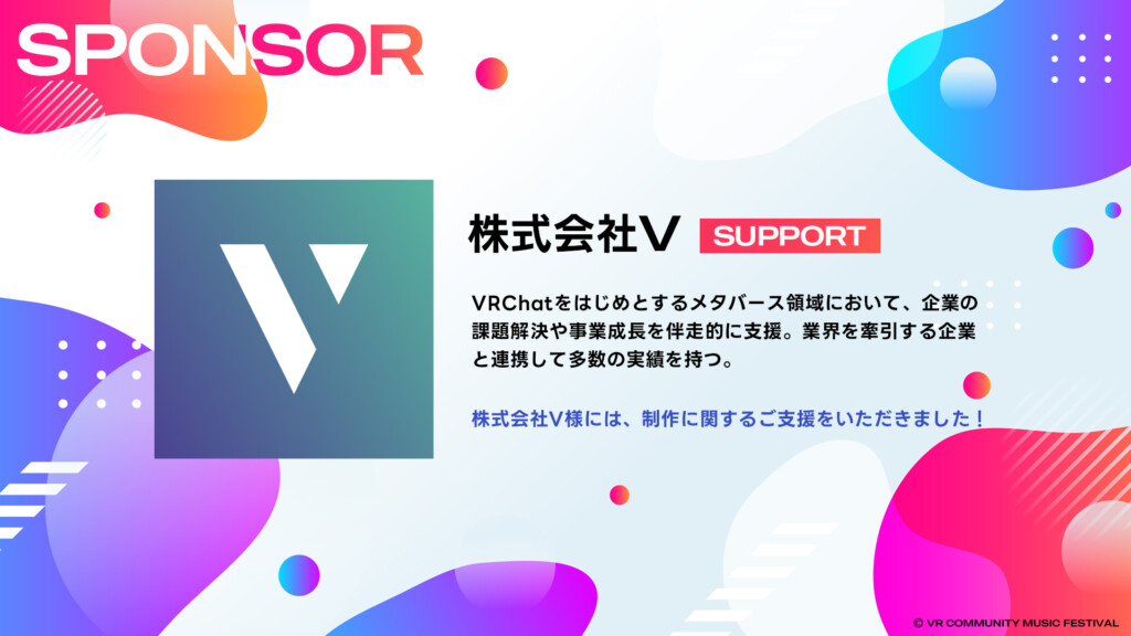 VRC音楽祭は、バーチャルならではの表現と熱量が交わる特別なイベントです。 私たちVも、この文化を共に楽しみ、育てていく仲間として協力させていただけることを嬉しく思っています。 ここからまた新しい音楽体験が生まれていくことを、心から楽しみにしています。
