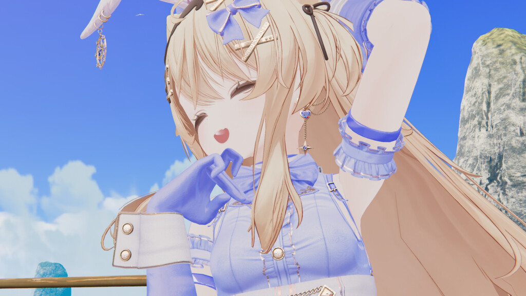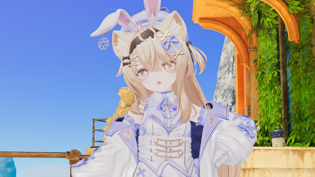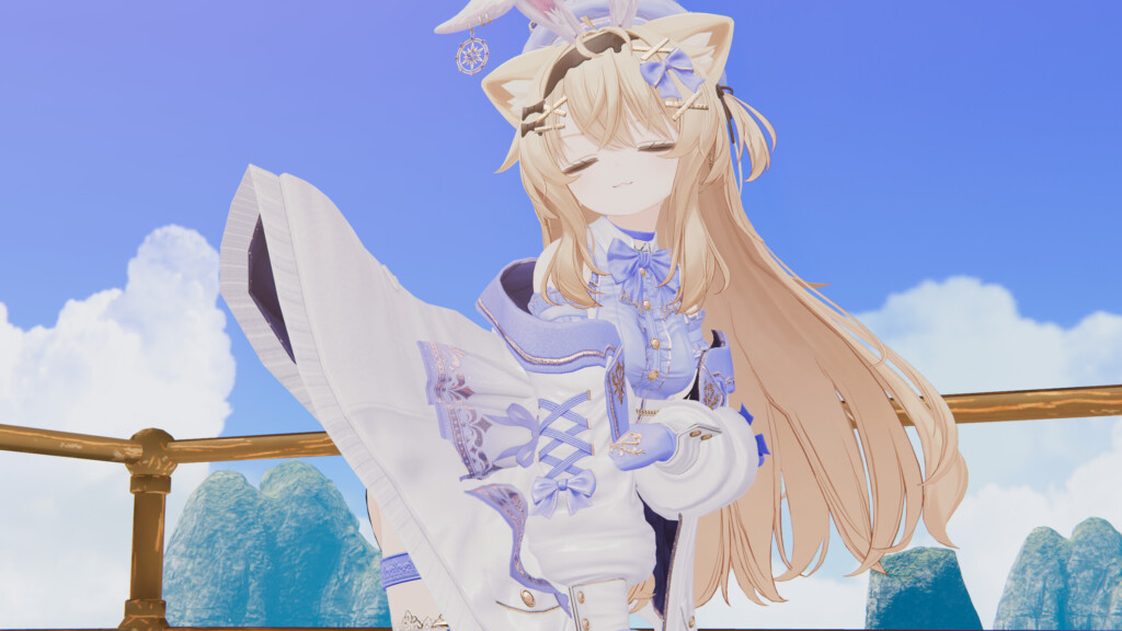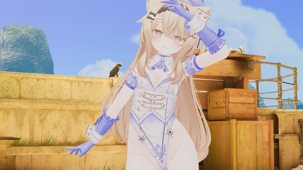 続いて、白×青カラーを sep-neko-ya『エク』で着用。頭身が低めのアバターでは「頑張っておめかししている」ような背伸び感が生まれ、また異なる可愛さが発揮されます。