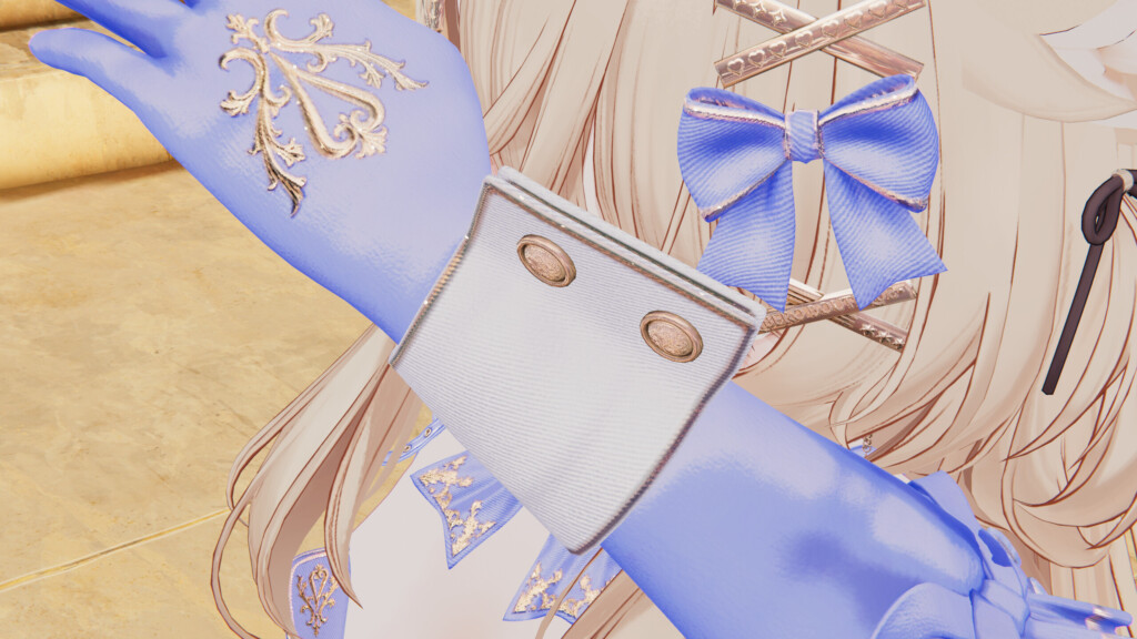 星のような装飾、バロック調/アラベスク風の模様が衣装全体のラグジュアリーさを際立たせています。細部までこだわりが詰まっているため、広大なVRChatの世界でもしっかりと存在感を出すことのできる衣装です。