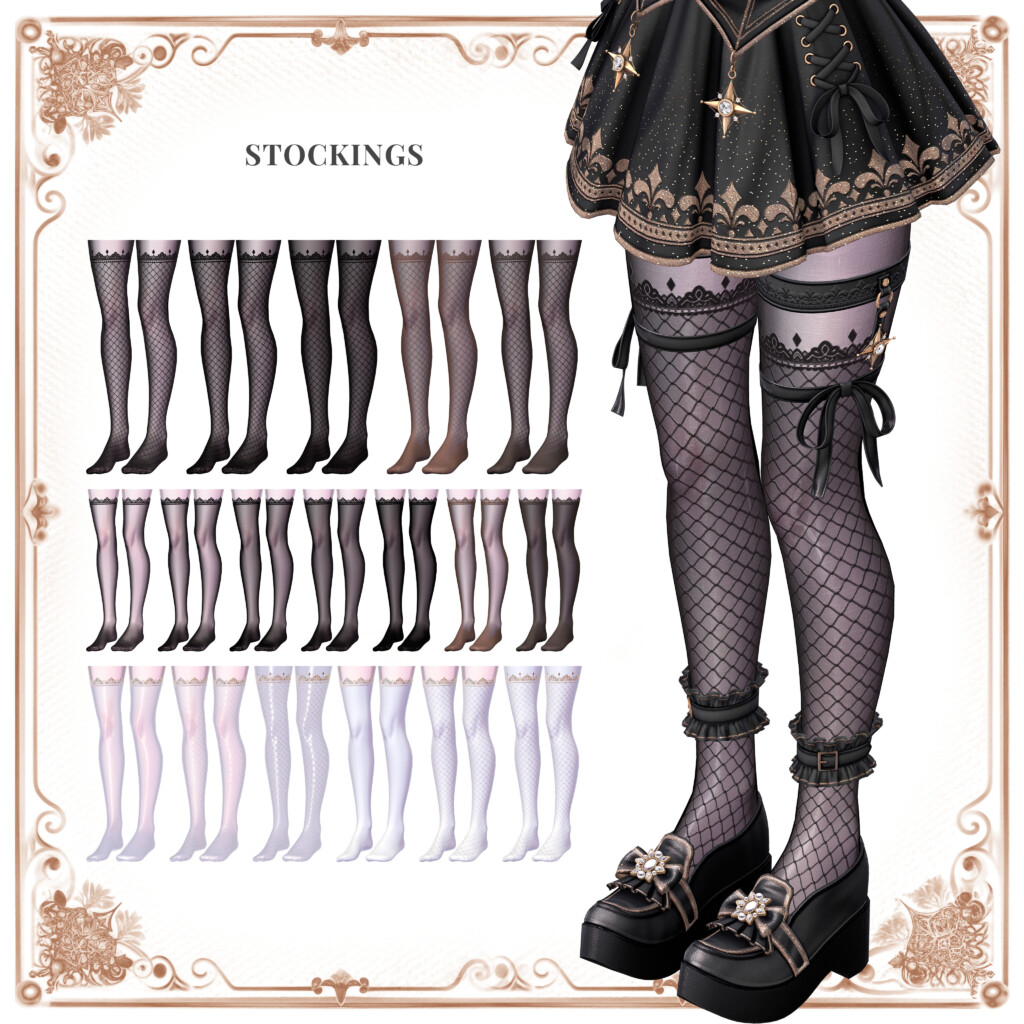ストッキングは15種類。黒から白までさまざまな色が用意されており、あえて黒でまとめた上で白ストッキングでアクセントをつけてみたり、はたまた逆に白 x 黒にしてみたりなど、細かなこだわりを反映したコーデも楽しめます。