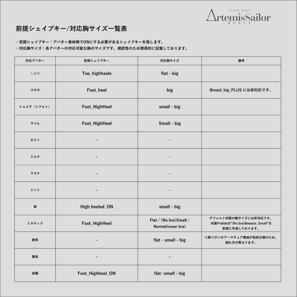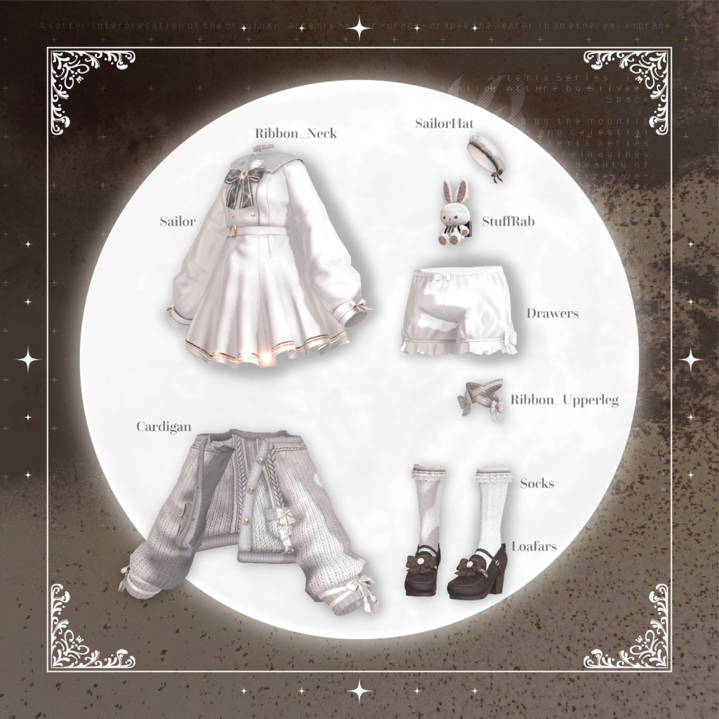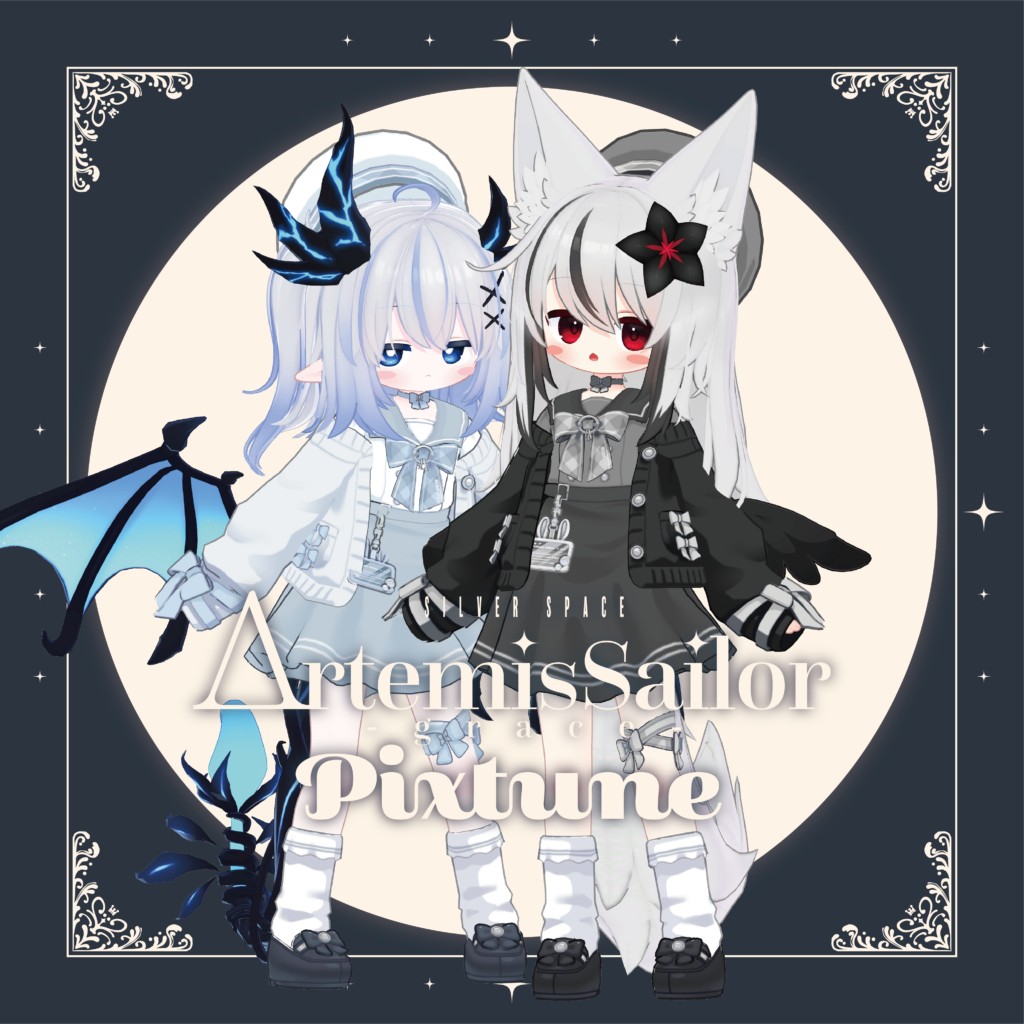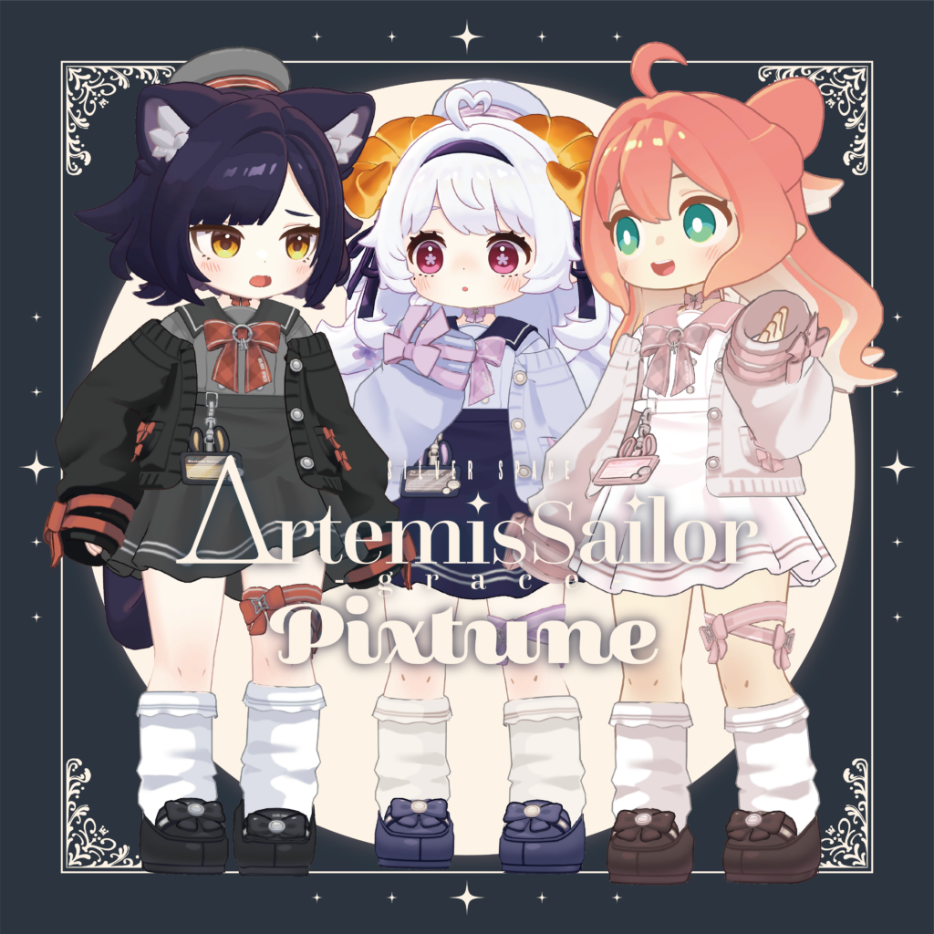 『ΔrtemisSailor – grace -“Pixtune”』は、『ΔrtemisSailor – grace -』の特徴はそのままに、デフォルメアバター向けに輪郭や陰影を表現した衣装です。トゥーン調の雰囲気に合わせた表現のため、様々なデフォルメアバターで着こなせます。