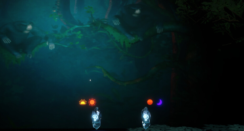 写真のように、クリスタルが浮いています。近くによっていくと、後ろの背景の映像が反応していきます。