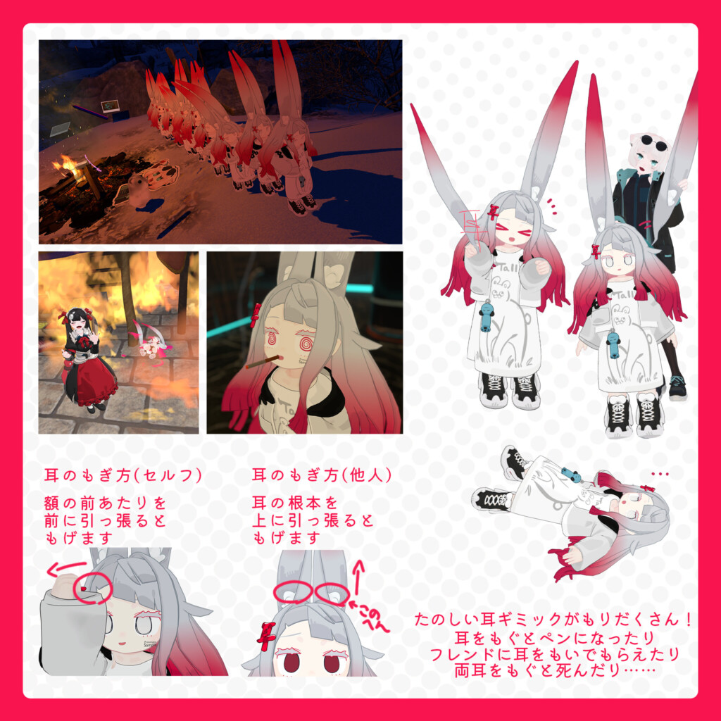 しっかりと、可愛さに振ることもネタに振ることもできるアバター「みみのこ」 ユーザーの改変によって味付けを変えることも可能なアバターなため、どんなユーザーでも使いやすいアバターになっています。