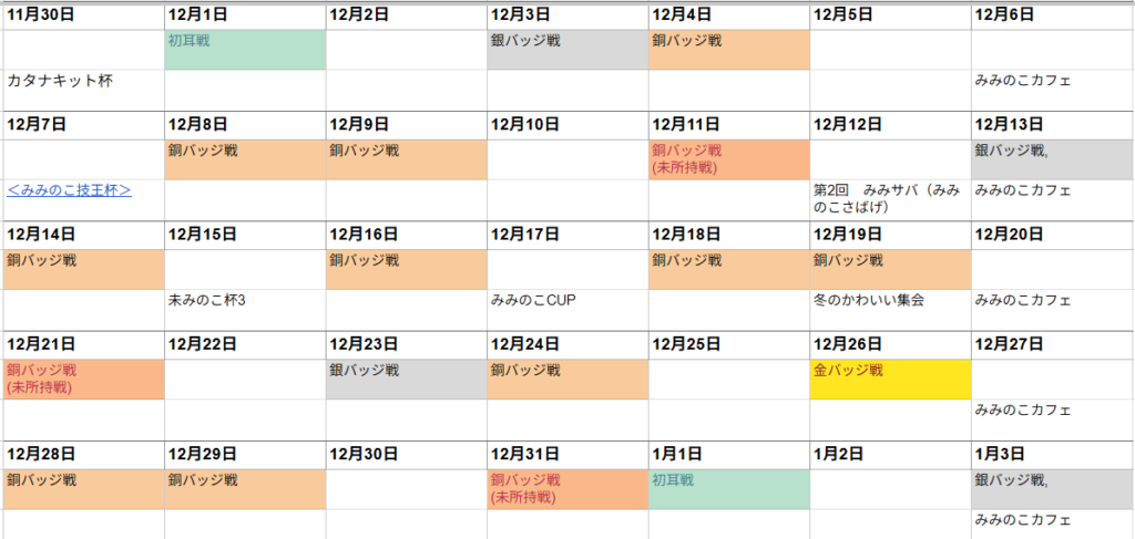 そんな一周年を迎えたアバター「みみのこ」の大きな特徴は、「みみのこ」公式グループが大きな盛り上がりを見せている点、公式Googleカレンダーを見ると「バッジ戦」が頻繁に開催されているのが分かります。