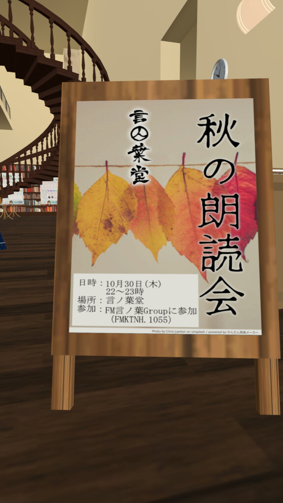 こちらはVRC内でアイドルグループとして活動されている「SEISO NO OWARI」のメンバー・でるふさん主催の朗読イベントです。