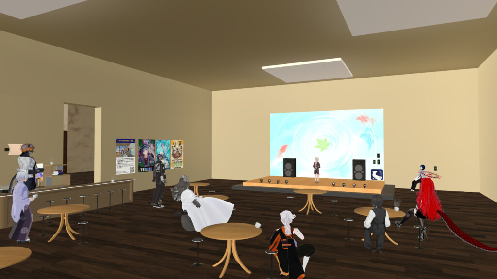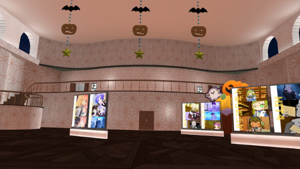 会場のワールドは2Fにラジオの収録ブース、1F にはVRCユーザーが書かれた作品を読むことができるギミックつきの読書スペースがあります。