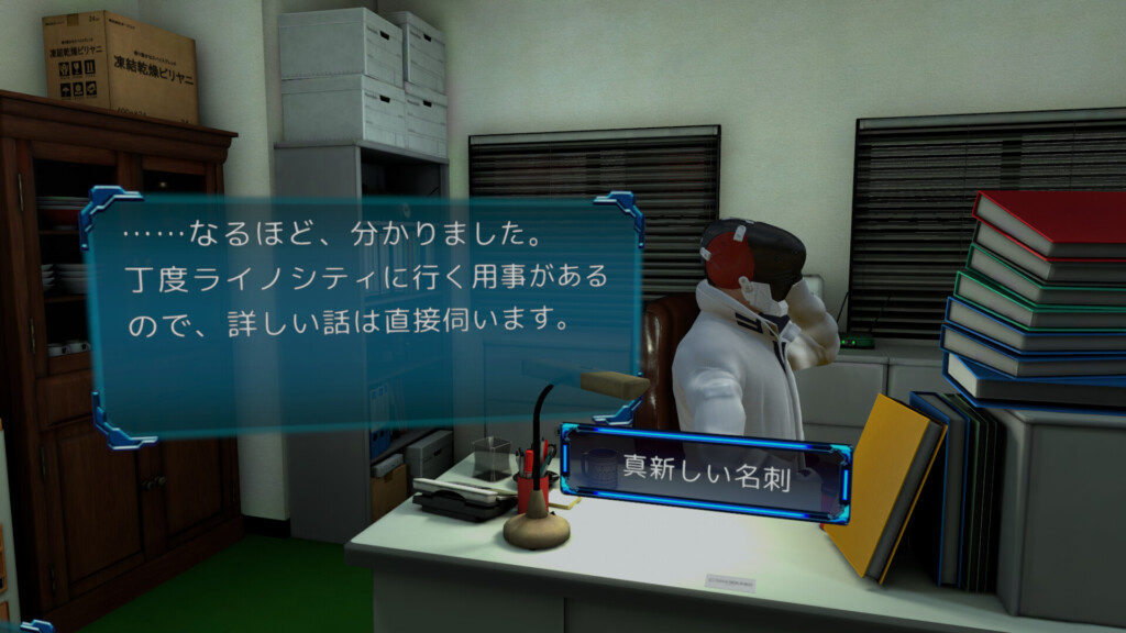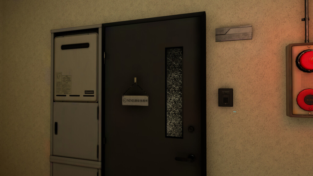 ゲームを始めると、マンションの中へ。ここからNINE探偵事務所へと向かいます。このゲームは、頭がマスクの「探偵」の助手となり、依頼を引き受けるところから始まります。