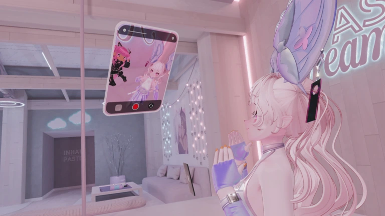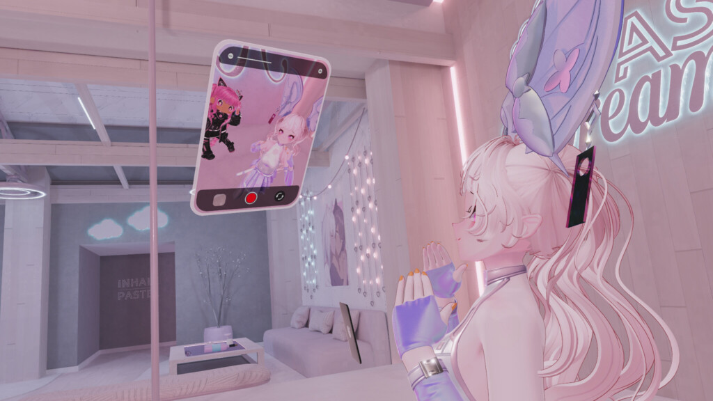 「VideoCap」は、VRChat内で5秒間の動画を簡単に撮影できるタブレット型ギミックです。実際のスマートフォンやタブレットのカメラと同じような感覚で、フレンドと一緒にワールドで遊んだ瞬間をその場で撮影&確認ができちゃいます。推しのファンサを録画したりもできちゃいます。活用方法は無限大です!