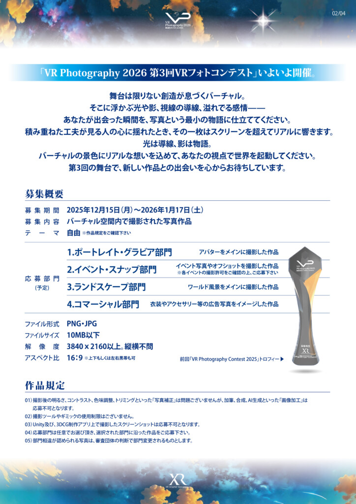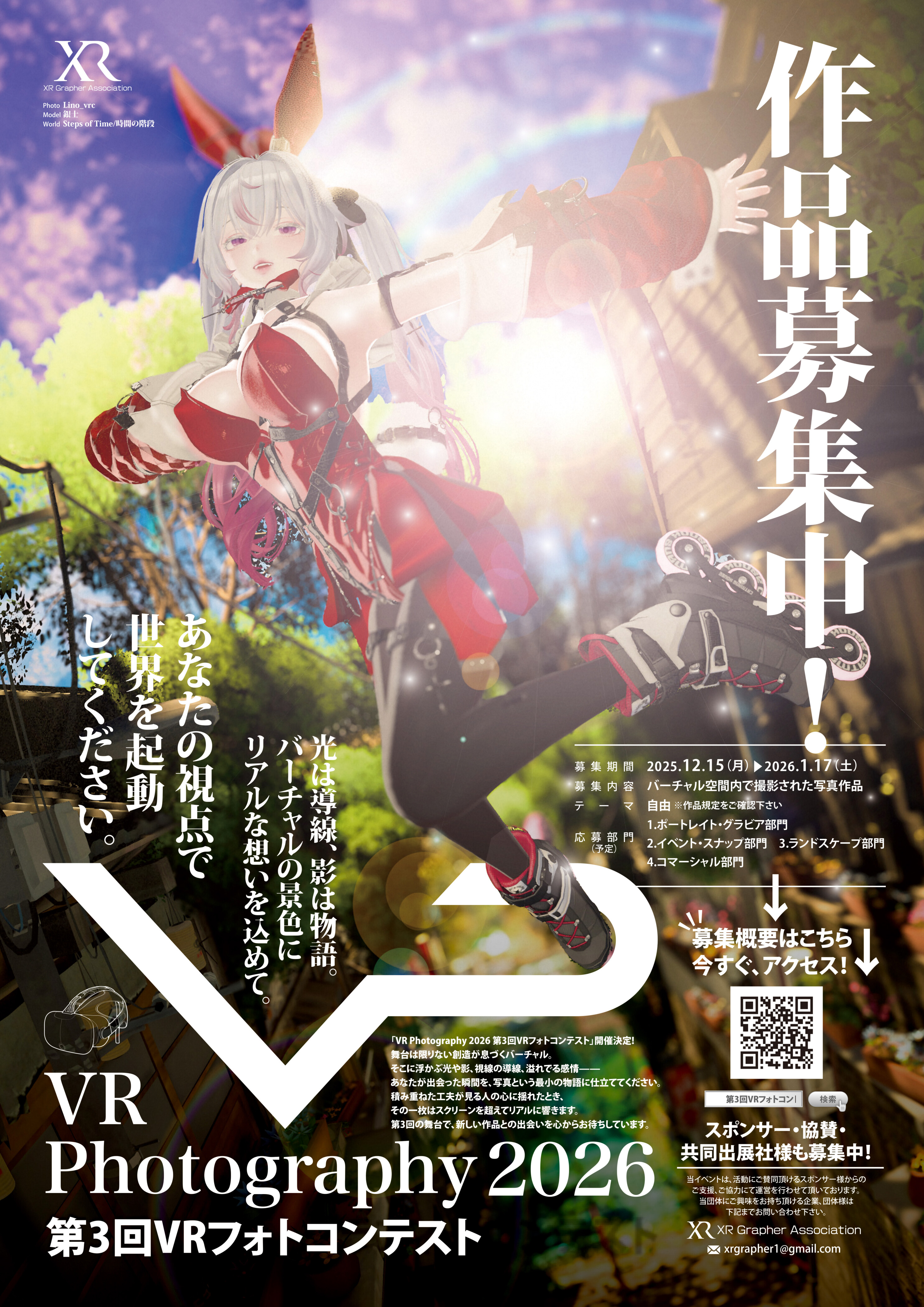 XR Grapher Associationは、2025年12月15日(月)から2026年1月17日(土)まで、「VR Photography 2026 第3回VRフォトコンテスト」を開催することを発表しました。