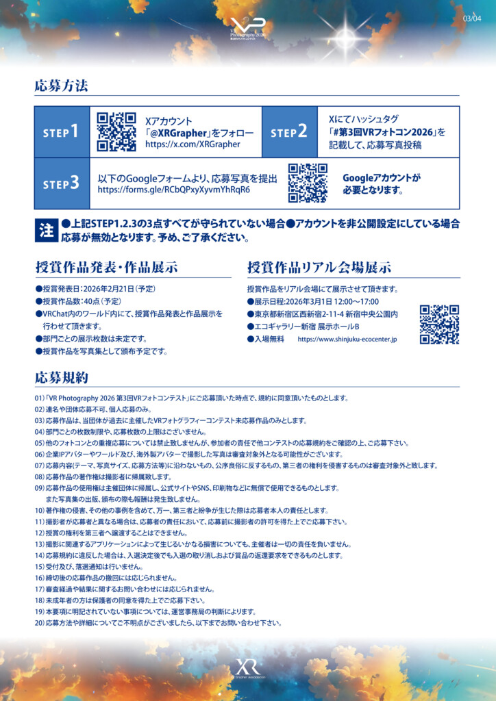 ・「VR Photography 2026 第3回VRフォトコンテスト」にご応募頂いた時点で、規約に同意頂いたものとします。
