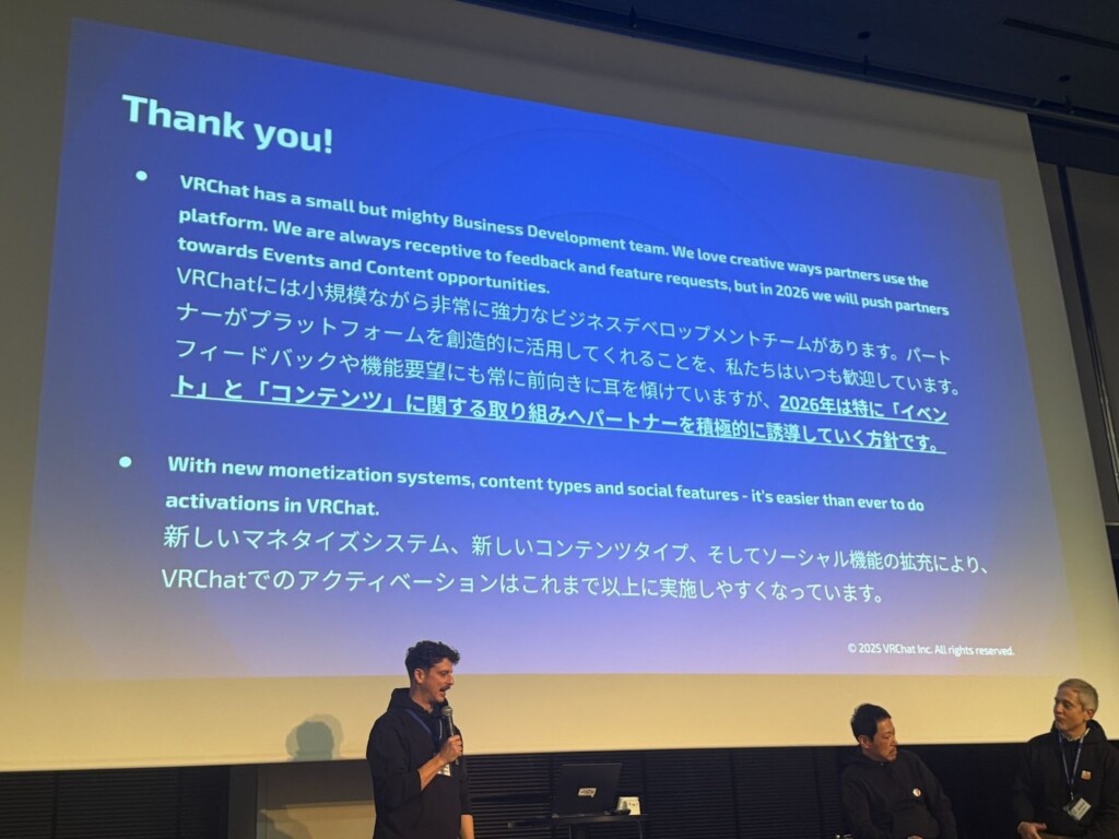 最後に、VRChatは2026年から「イベント」と「コンテンツ」に関する取り組みに、パートナーたちを積極的に誘導していく方針と語りました。来年からは今までより多くの企業やIPが、VRChatでイベントを行い、アイテムなどのコンテンツとして、ユーザーの手に渡ることが増えてくるかもしれません。