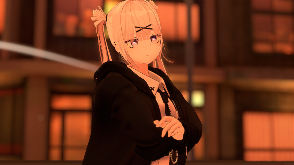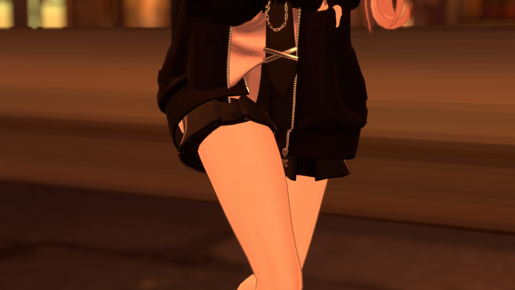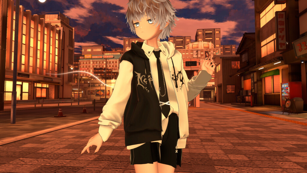 VRChat内で見ると、ラフさはありつつも、スタイリッシュでかっこいい雰囲気がしっかり伝わってきます。VRChatは装飾が多い衣装や派手なワールドも多く、シンプルな服だと埋もれてしまうこともありますが、この『Hoodie Set』はそのシンプルさの中に「かっこよさ」を詰め込んだ仕上がりなので、ちゃんと目立ちます。