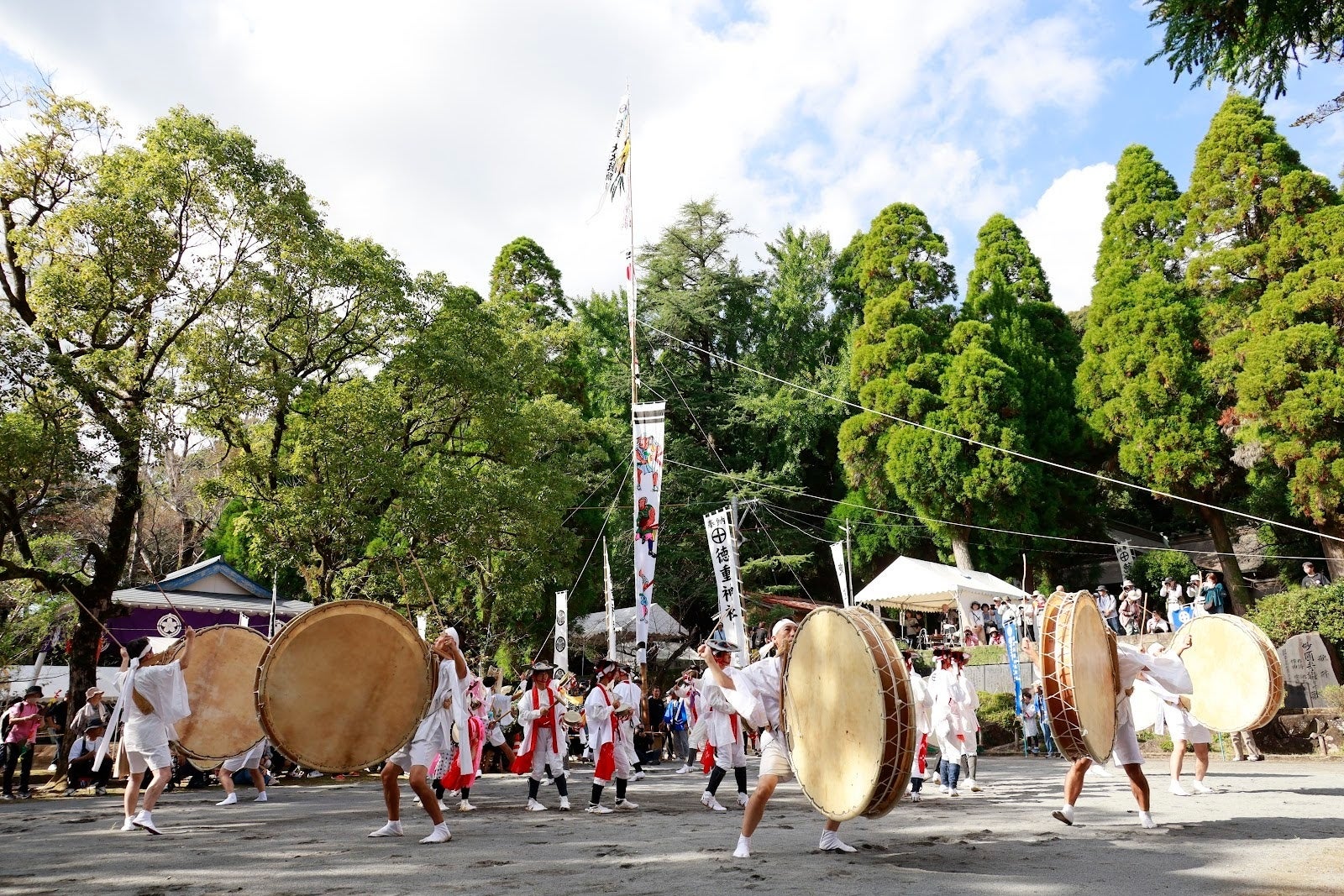 鹿児島県日置市の徳重大バラ太鼓踊りは、島津義弘公の武勇を称えたと伝わる勇壮な踊りです。高い幟を立て、直径1.5mの大太鼓を打ち鳴らし、威嚇して勝利する様を今に伝える伝統芸能。毎年10月第4日曜日の妙円寺詣りの期間に徳重神社で奉納されます。