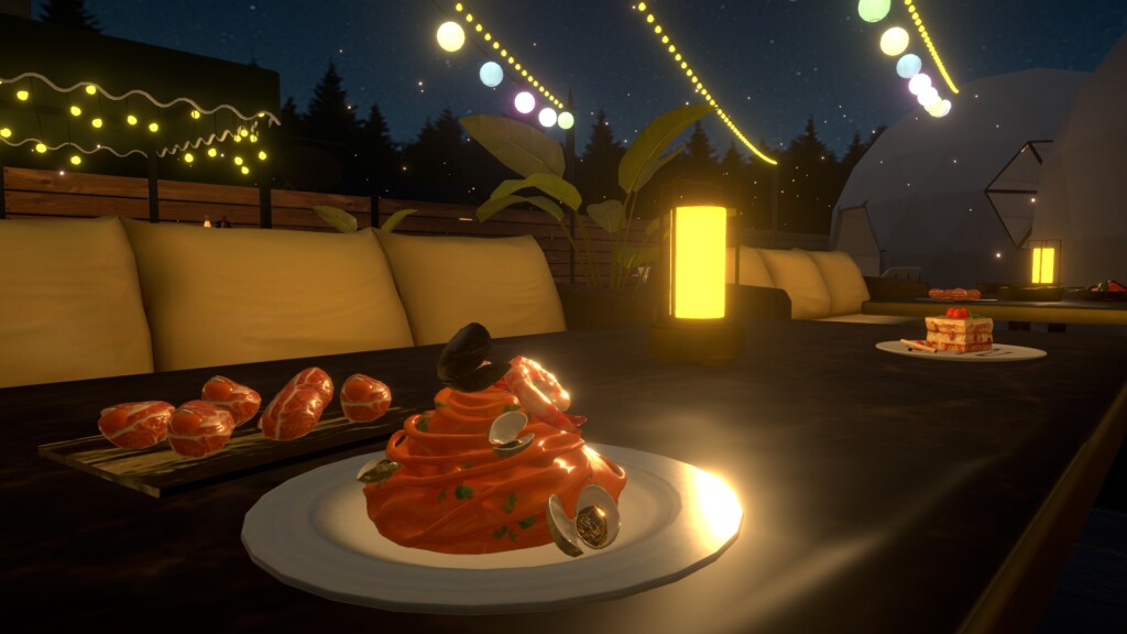 ダイニングエリアやグランピングエリアなどが広がり、パスタをはじめとした豊富なメニューが3Dモデルとして登場。