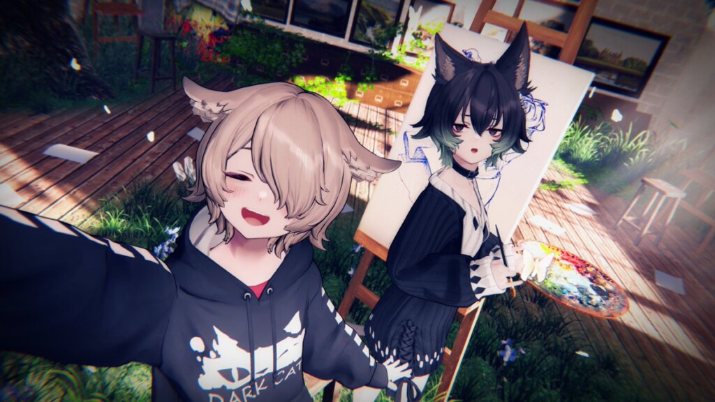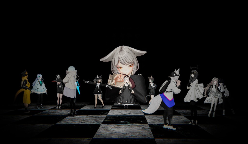 すべてのアバターを対角線上に配置し、進行方向を揃え、服装にも統一感を持たせるなど、多人数作品ならではの細部への配慮が随所に感じられ、非常に見やすい構成になっています。