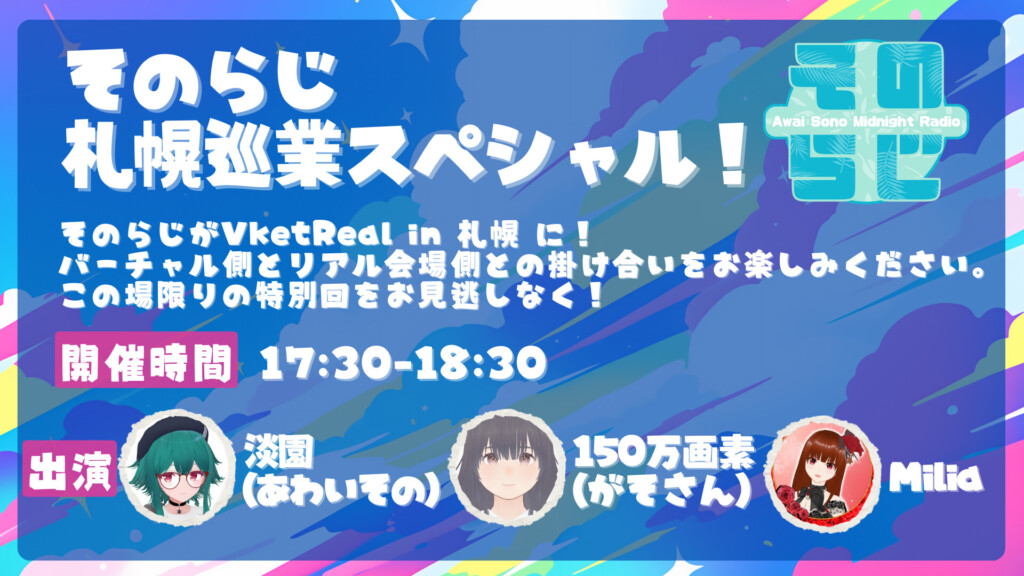 目玉企画2つ目は、VRChatの人気ラジオ番組「そのらじ」のスペシャル版。「札幌巡業スペシャル」と銘打って、リアル×バーチャル会場から、お届けします。