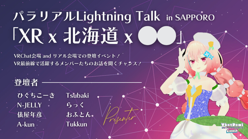 物理的な制約を超えるXR・メタバースの力が、この北の大地でこそ最も輝くと信じています。今XRで最もアツい地方といわれるであるリアルの札幌の熱気と、バーチャルの無限の可能性を融合させ、このイベントからVRSNS系イベントの新しい景色を描き出します