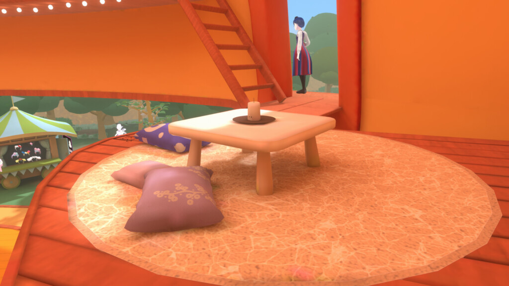 全体的に木の温もりを感じるデザインになっており、1階と庭にゲーム要素が集約されています。2階へ登ると、みんなで集まれるスペースがあり、さらに最上階には寝転べるベッドも。天井には鏡を出せるスイッチまで完備されています!