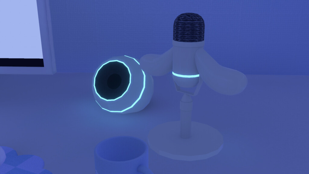 細部を見ていくと、シナモンの耳を模したマイクやコントローラーも壁掛けラックに置かれています。このマイクなどは、実際に製品化してほしいほどのクオリティです。